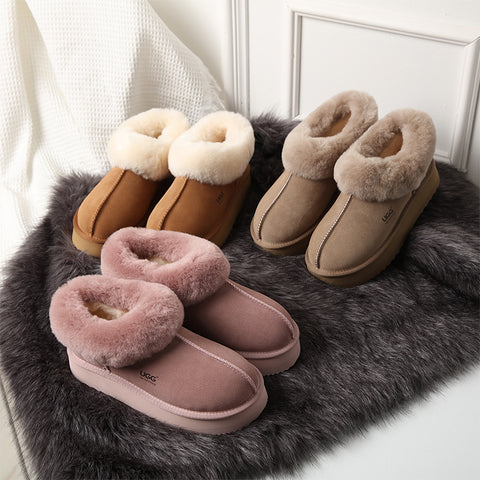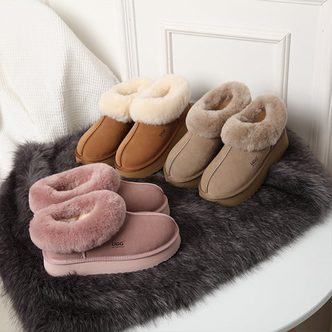 Stay cozy and chic with our uqdfgg Platinum Platform Slippers! Made of luxe sheepskin wool that'll keep your feet warm and comfy, but also features a water-resistant upper so that it's easy to clean. It's the PERFECT combination of style & convenience. Plus, the mod design gives it a little extra somethin'-somethin' that you can rock at home OR on the street. So slip into style with these slippers!